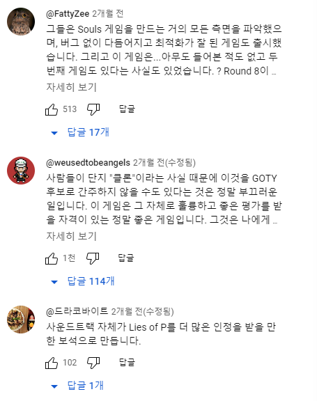 댓글도 대부분 우호적입니다. 나한테는 P의 거짓이 GOTY라고 하는 댓글들도 눈에 보입니다.